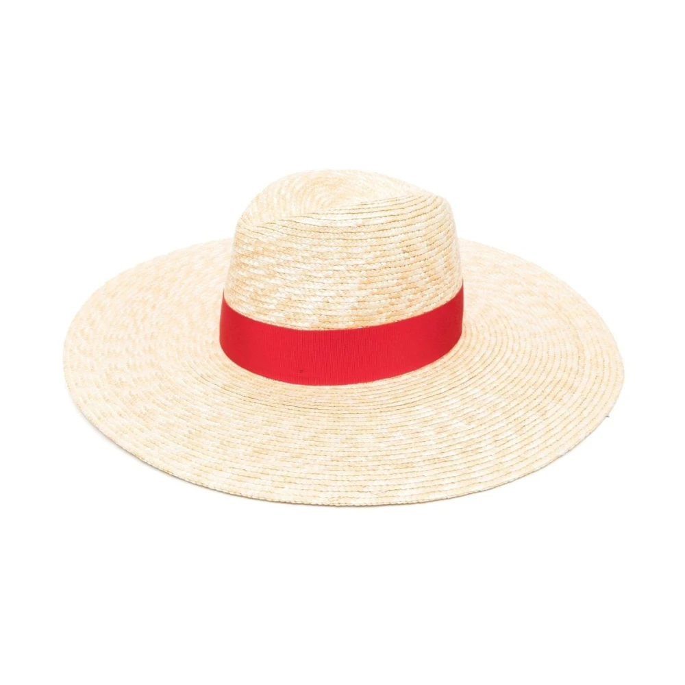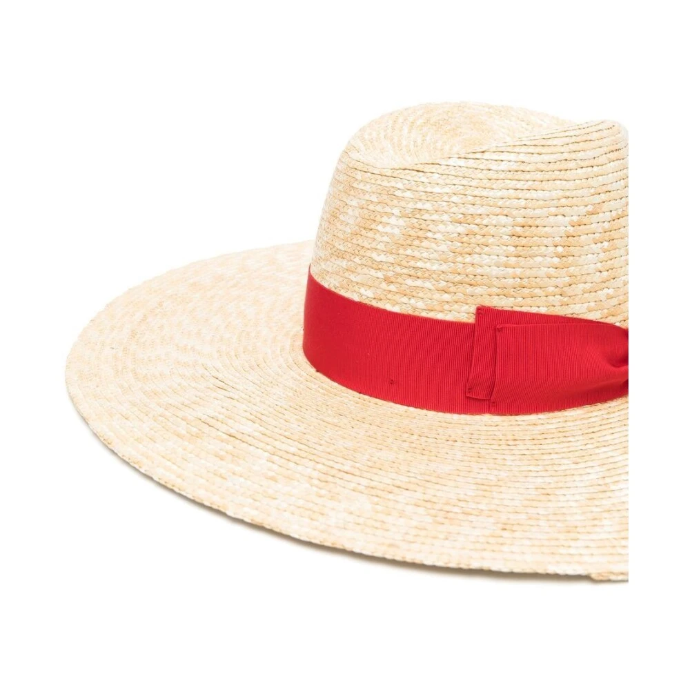 Borsalino Hats Red Sophie Wide Brim Panama Hat fra Borsalino med beige, rød, halm, menvevd design, håndlaget effekt, buedetaljer, gulltonet logobokstaver, bred rand og grosgrain hatband.