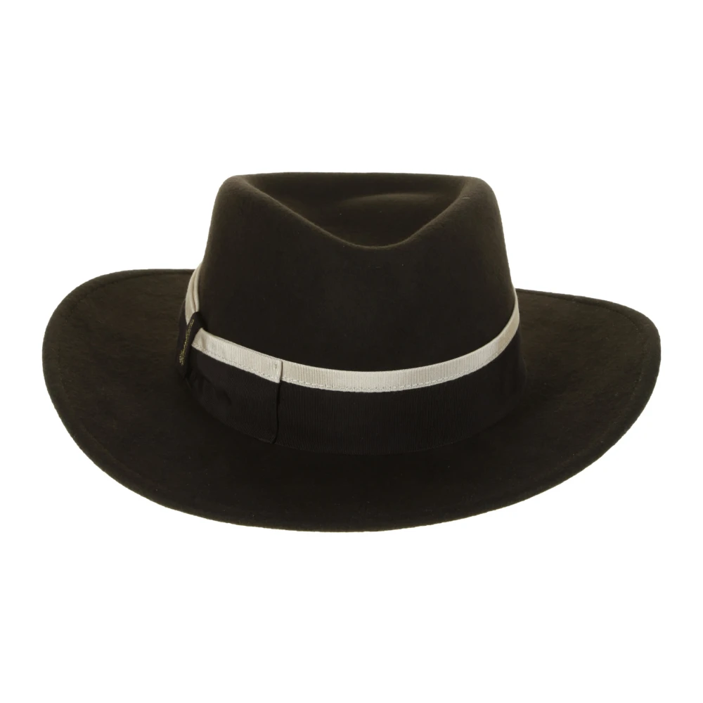 Borsalino brun ullhatt, bred rand, brunt og krembånd, logo detalj.Denne beskrivelsen er automatisk oversatt.