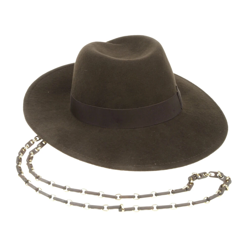 Borsalino ull følte hatt med uforet interiør, stor rand, avtakbar kjede og gylden trykt logo.
