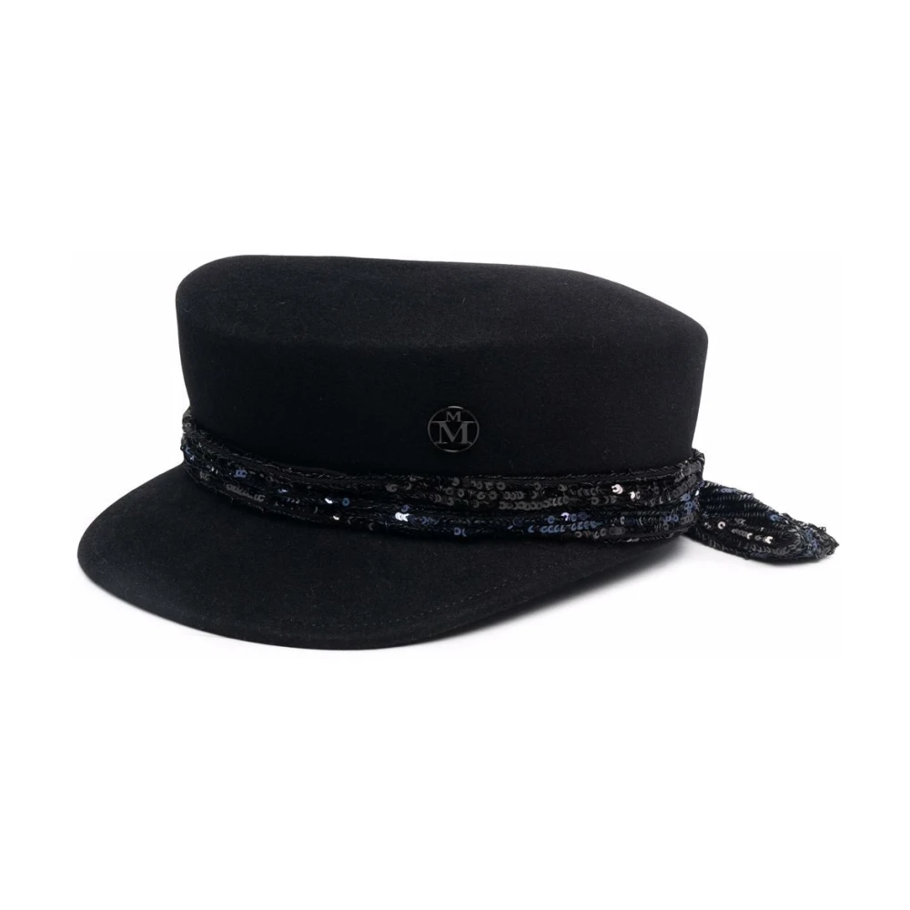 Maison Michel Hats Black Black Rabbit følte Logo-Plaque Baker Boy Cap fra Maison Michel med logo-plakk, paljettpynt, skjerfdetaljer og buet topp.Denne beskrivelsen er automatisk oversatt.