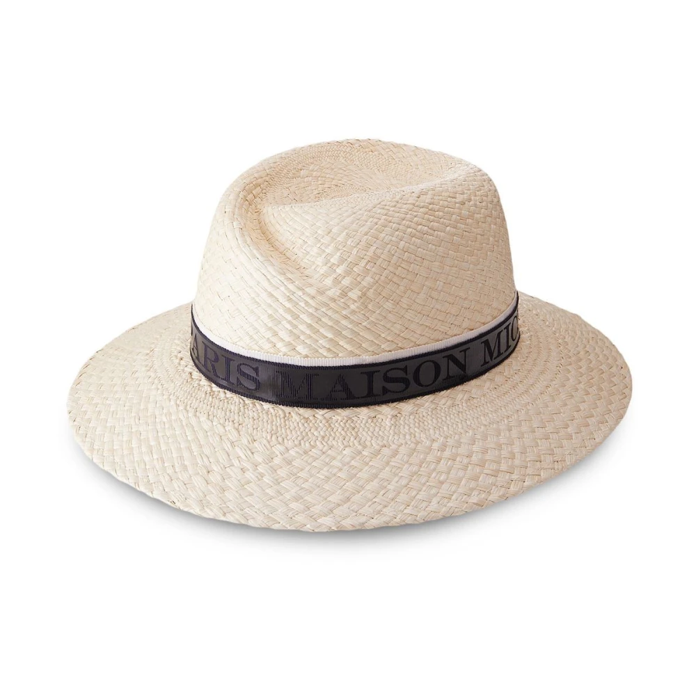Maison Michel Hats Beige Virginie Straw Fedora fra Maison Michel med intervevd design, båndbånd, logo -trykk til siden, buet bred rand, naturlig hvit og halm.