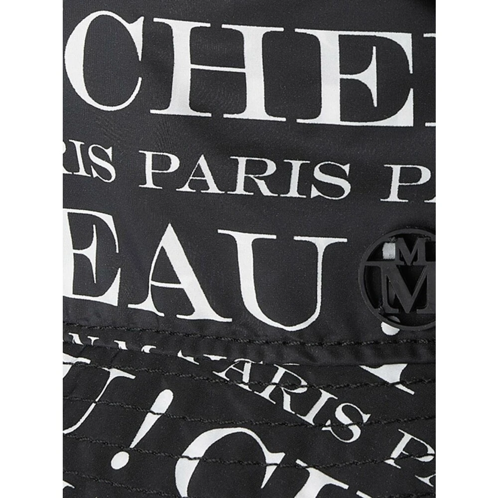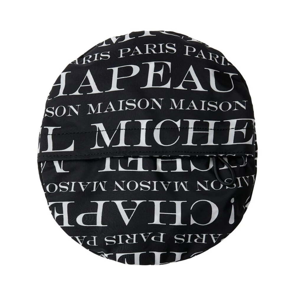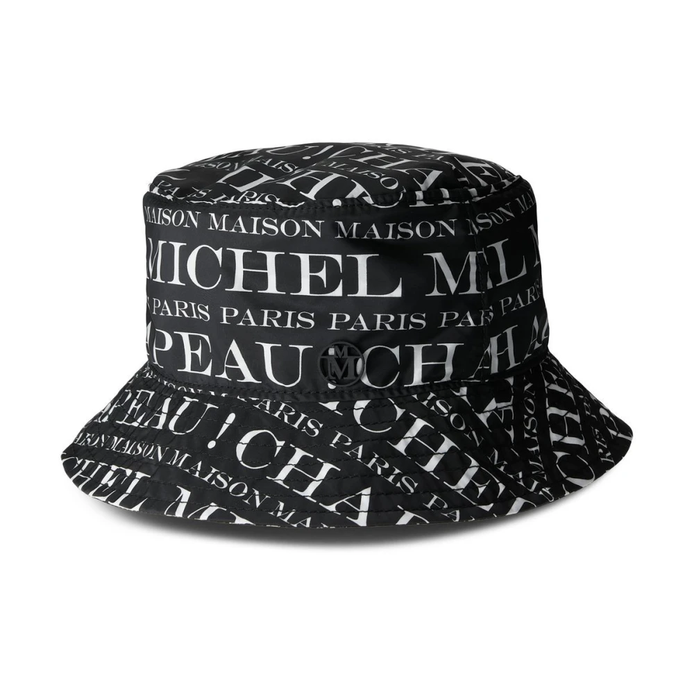 Maison Michel Hats Black Jason Logo-Print Bucket Hat fra Maison Michel med svart/hvitt, all-over logo-trykk, logo-plakk, flat krone, droppet smal rand og sammenleggbar design.