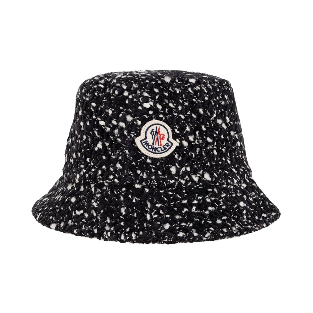 Svart og hvit bøttehatt fra Moncler. Laget av en ullblanding, er denne gjenstanden dekorert med en logolapp i krem, marine og rødt.