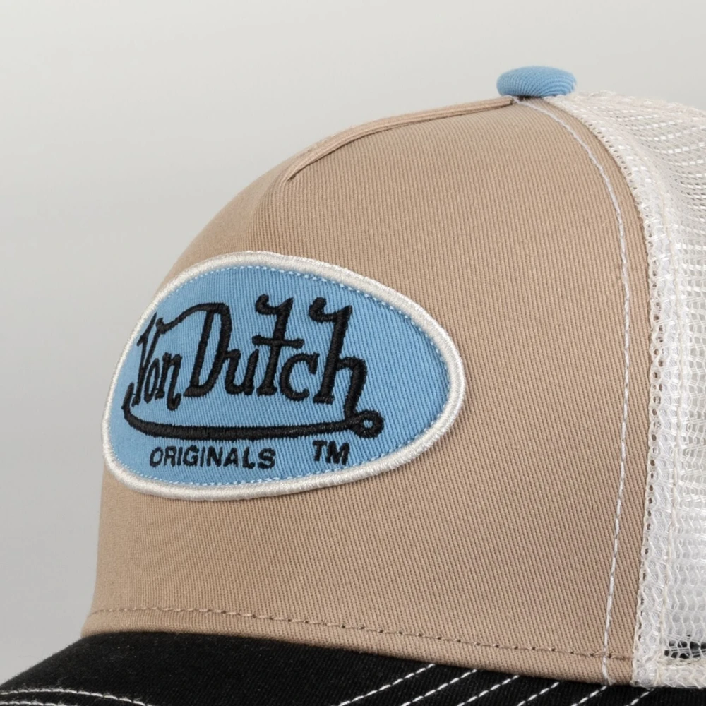 Trucker Boston fra Von Dutch. De ikoniske capsene fra Von Dutch er tilbake. Trucker Boston er en klassisk trucker caps med pustende mesh bak og stor, brodert logopatch i front. Capsen har hvit netting, blå brodert logo og beige stoff med sort brem, og regulerbar størrelse. – Von Dutch logopatch- Pustende mesh bak- Buet brem- Justerbart panel- One Size
